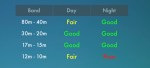 During the day propagation is limited to local contacts, but long distance contacts are possible at night, especially around sunrise and sunset.